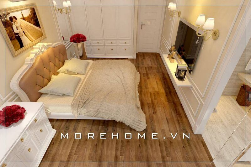 Trang trí nội thất phòng ngủ biệt thự cao cấp tại Hà Nội với mẫu giường ngủ gỗ óc chó nhập khẩu bọc nỉ nhung ấn tượng