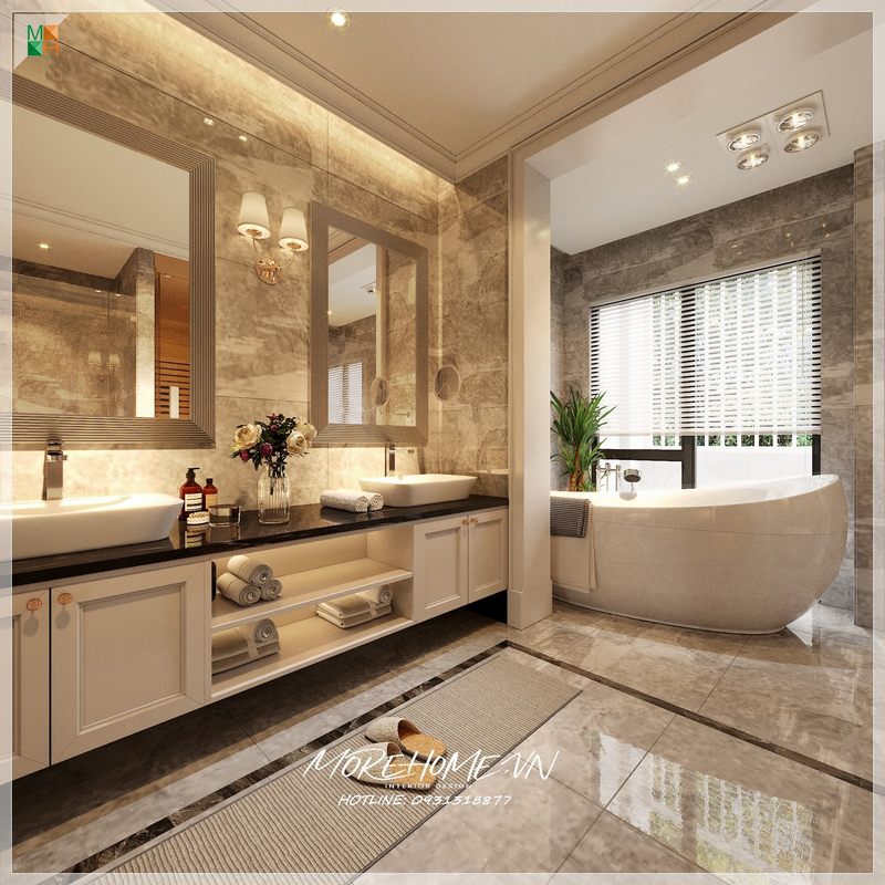 Phòng tắm được thiết kế đẹp với bồn tắm cao cấp và nội thất hiện đại, tiện nghi.